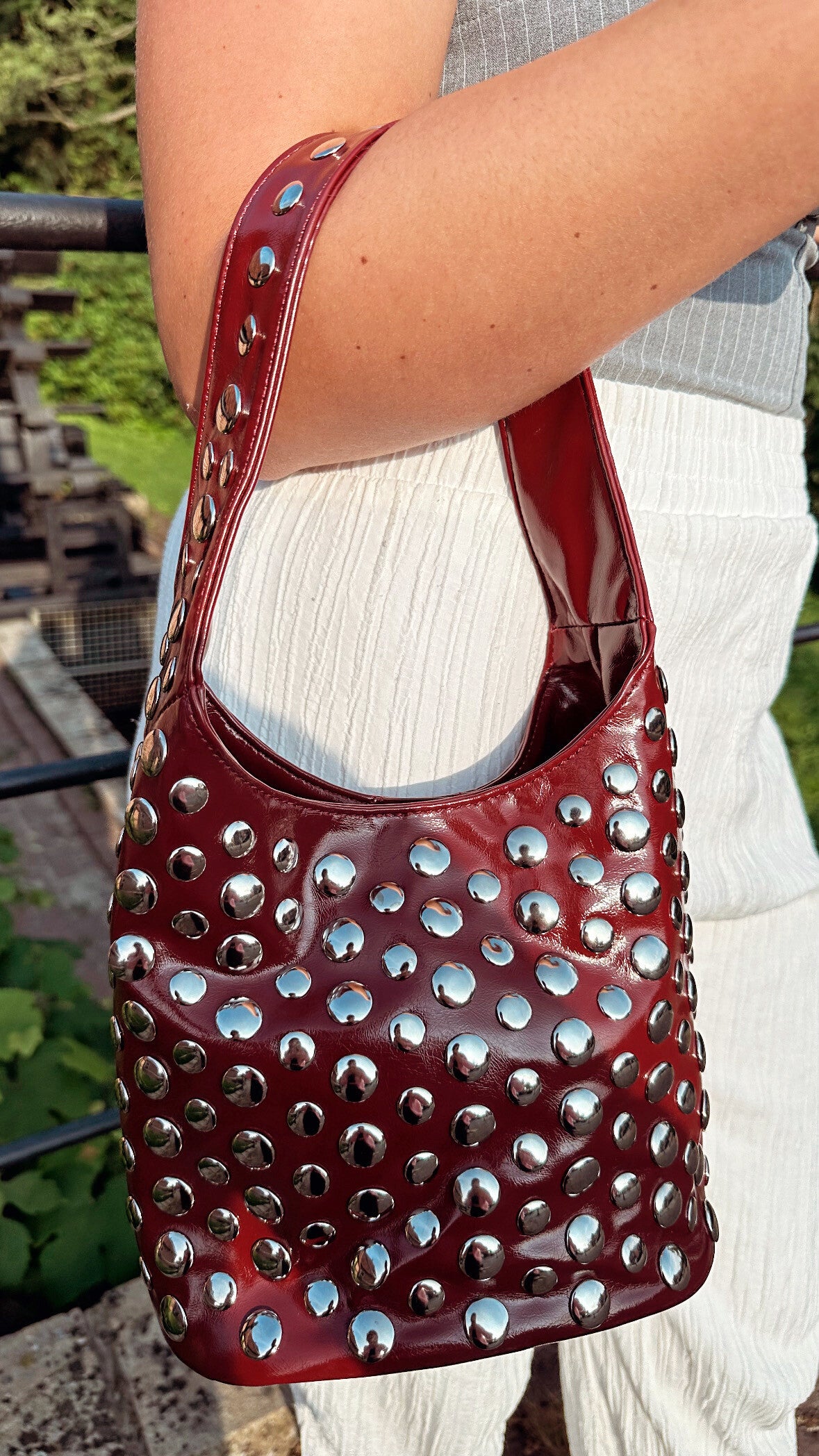 Shop deze te gekke Studs tas met een mooie bordeau kleur, perfect voor de herfst wat er aan komt!